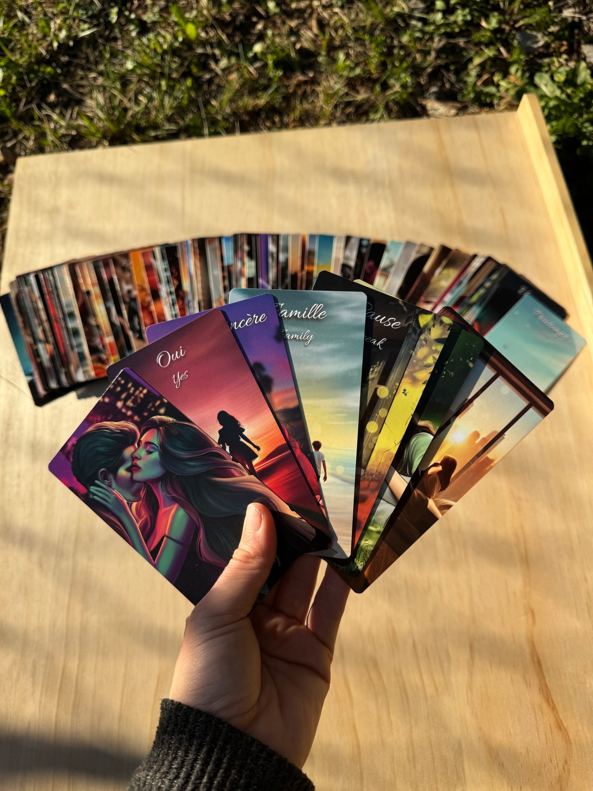 - 81 cartes illustrées à la main (format 68 mm x 128 mm), aux messages profonds